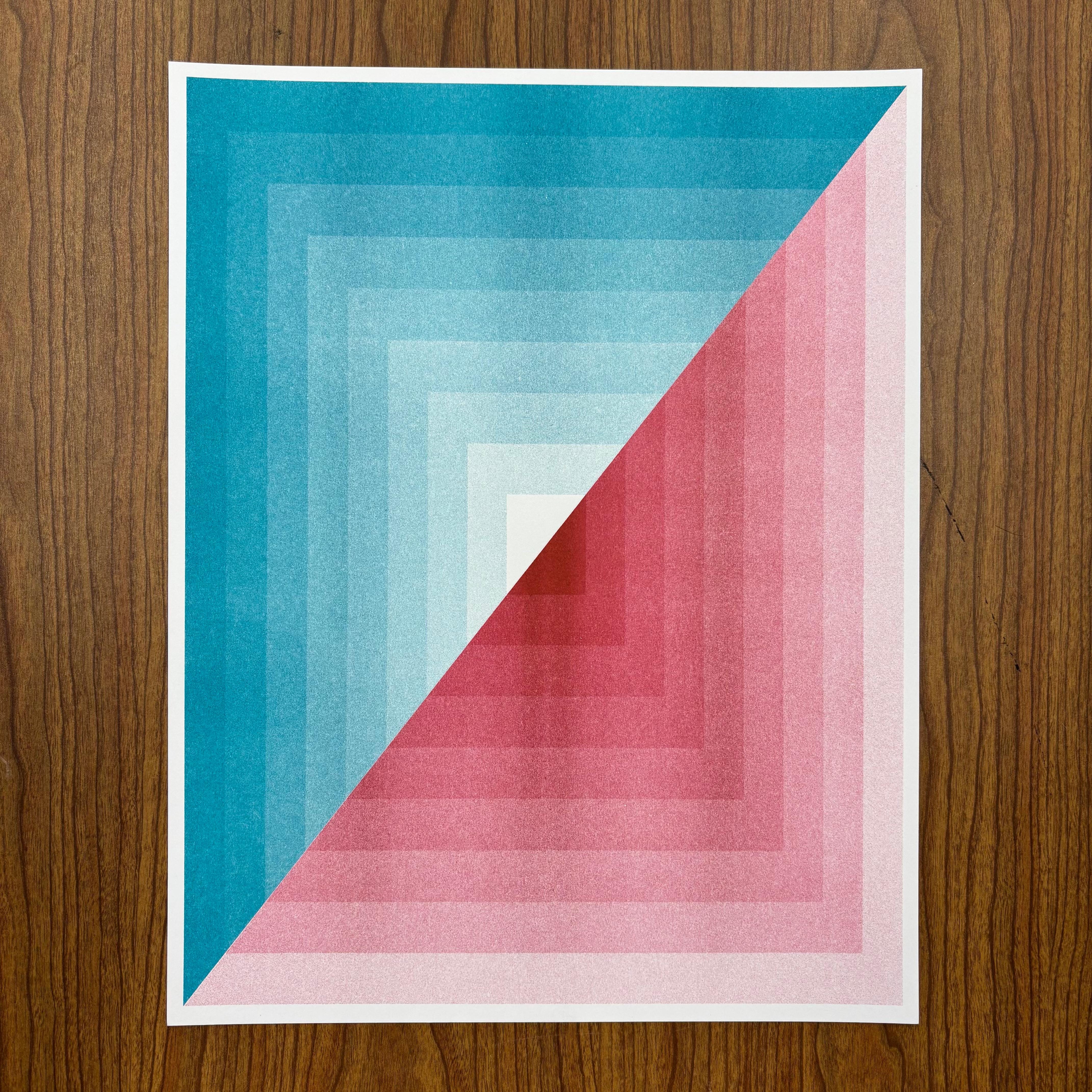 Chroma Steps is a series of prints exploring the space between colors. Each Risograph print uses the machine's unique screen printing process to investigate color and movement through interpolation. Colors march across the page in harmony, changing into and away from one another.